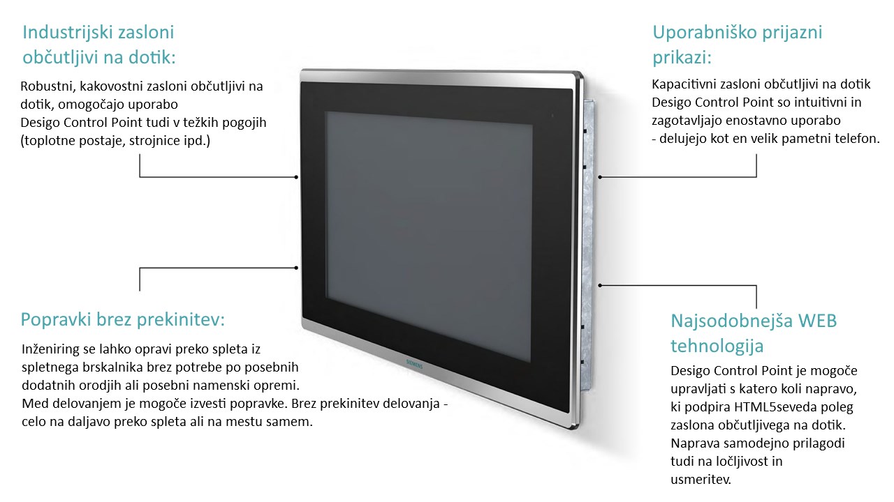 Desigo Control Point omogoča enostavno upravljanje naprav na primernem nivoju priprave energije – torej v toplotnih/hladilnih postajah, strojnicah. Kapacitivni zasloni visoke ločljivosti zagotavljajo odlično uporabniško izkušnjo in intuitivno delovanje. Alarmiranje, urniki in prikazi trendov – vse popolnoma grafično podprto, vse na dosegu roke.